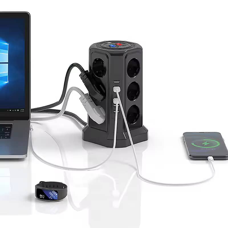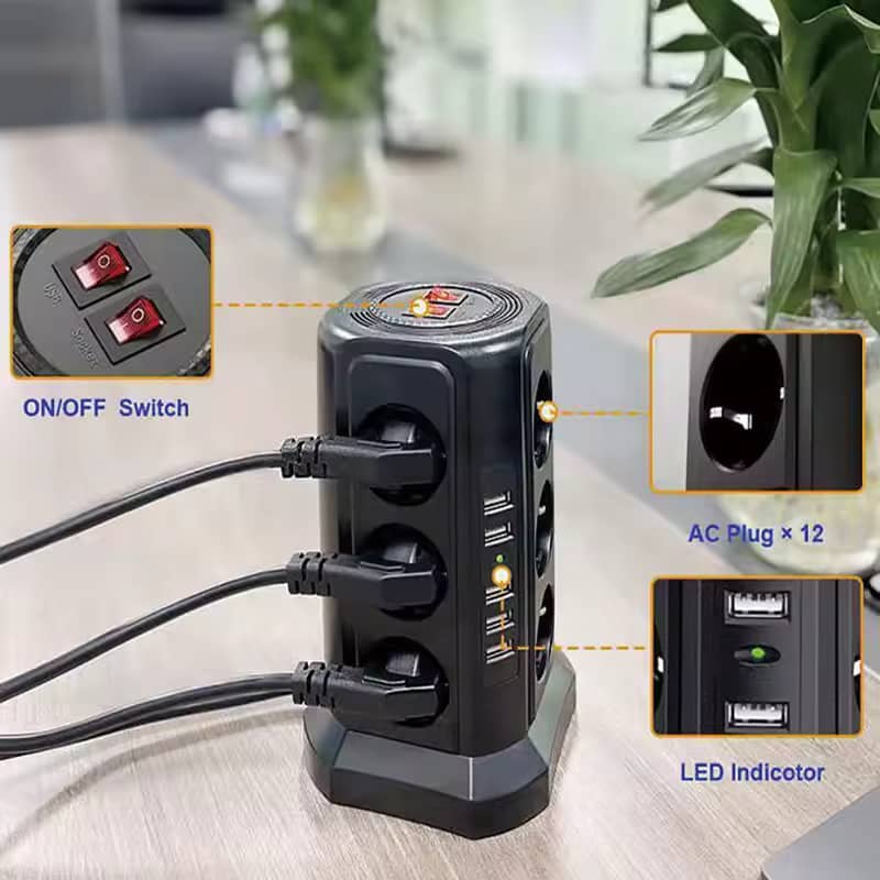 • برند: KUTUMAI• مدل: XT-G3211 (KU-GH006-Black)• نوع: چندراهی برق عمودی (برج برق چندمنظوره)• دارای 12 پریز استاندارد اروپایی (EU Plug)• دارای 5 پورت USB با خروجی کلی 5V / 4.5A• توان خروجی کل: 2500 وات• جریان مجاز: 10 آمپر• ولتاژ ورودی: 220 تا 250 ولت / 50-60Hz• دارای کلید اصلی و کلیدهای کنترل مستقل (Sub-control)• کابل ضخیم مس خالص 1.8 متری• ساختهشده از جنس مقاوم ABS و PC ضدحریق• دارای محافظ نوسان برق (Surge Protector)• وزن: حدود 905 گرم• مناسب برای منزل، محل کار، اتاق کنفرانس و میز کامپیوتر• طراحی عمودی برای اشغال فضای کمتر و نظم بیشتر