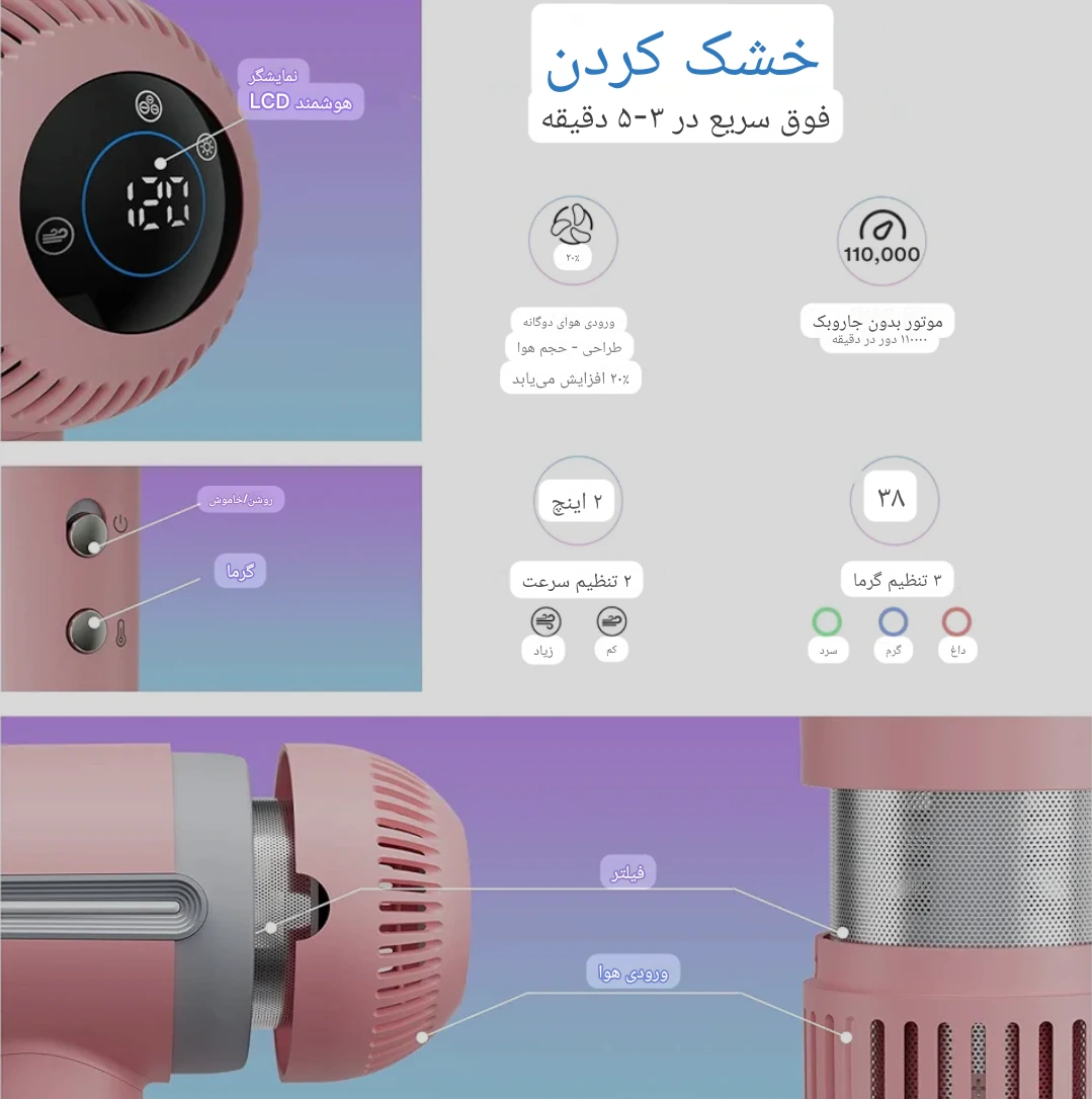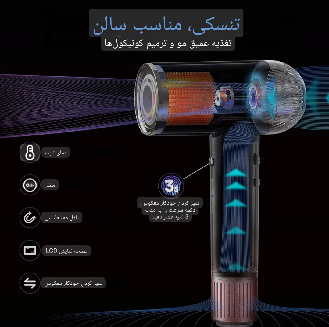 سشوار یونی Tensky مدل SKY-S200 یک انتخاب حرفهای برای کسانی است که به دنبال خشک کردن سریع، مراقبت از مو و طراحی مدرن هستند.این سشوار با موتور بدون برس ۱۱۰,۰۰۰ دور در دقیقه و سرعت باد ۲۳ متر بر ثانیه، موها را در کمترین زمان ممکن خشک میکند و با فناوری یون منفی، الکتریسیته ساکن و وز مو را به حداقل میرساند.سشوار Tensky از نمای جلو با طراحی مدرنویژگیها و مشخصات اصلیموتور پرقدرت بدون برس با سرعت فوقالعادهنمایشگر هوشمند LCD برای مشاهده حالتها و تنظیماتکنترل هوشمند دما ۱۰۰ بار در ثانیه برای جلوگیری از آسیب به موطراحی سبک و مناسب استفاده خانگی و مسافرتیفیلتر قابل شستوشو برای افزایش طول عمر دستگاهنازل مگنتی برای حالتدهی دقیقترمزایای فناوری یون منفیاین سشوار با تولید میلیاردها یون منفی، الکتریسیته ساکن مو را کاهش میدهد، موها را نرمتر و درخشانتر کرده و به سلامت موها کمک میکند.محتویات داخل جعبهسشوار یونی Tensky مدل SKY-S200نازل مگنتی متمرکزکننده هوادفترچه راهنما