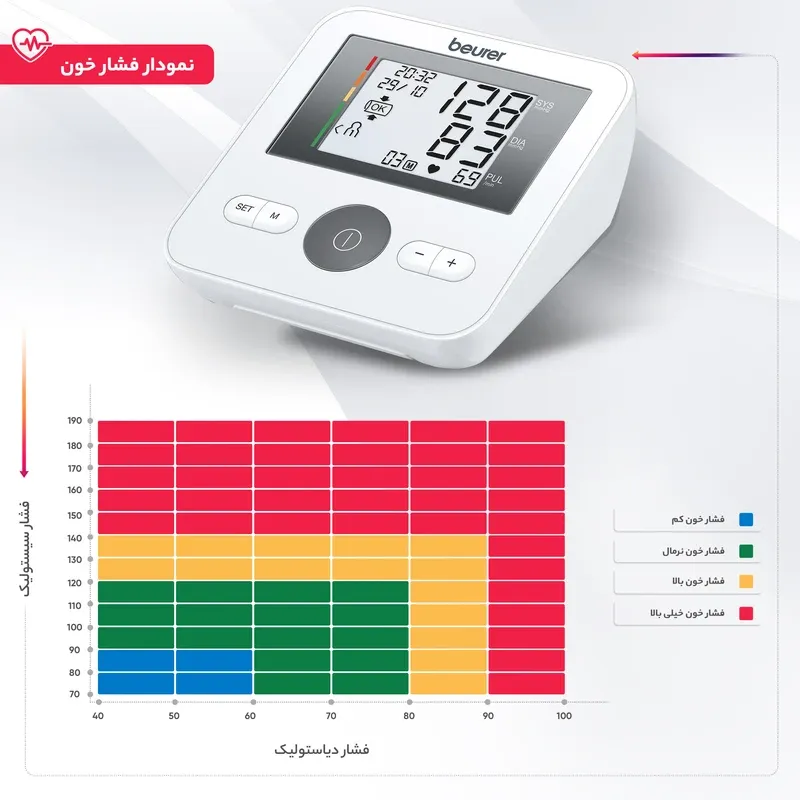 🩺 فشارسنج دیجیتال بازویی Beurer BM27 – انتخابی مطمئن برای سلامت قلب شمااگر به دنبال یک فشارسنج دقیق، کاربردی و با کیفیت ساخت آلمان هستید، مدل Beurer BM 27 از برند معتبر بیورر (Beurer) یک گزینه ایدهآل برای استفاده خانگی و نیمهحرفهای است. این دستگاه بهصورت تماماتوماتیک فشار خون و ضربان قلب را از ناحیه بازو اندازهگیری میکند و با ویژگیهای هوشمند خود، دقت و راحتی در استفاده را برای کاربر فراهم میسازد.• اندازهگیری تمام اتوماتیک فشار خون روی بازو• تشخیص آریتمی (نامنظمی ضربان قلب) و اعلام هشدار در صورت بروز آن• نشانگر رنگی ریسک فشار خون بر اساس استاندارد سازمان جهانی بهداشت (WHO)• کنترل وضعیت بستن صحیح کاف (Cuff Position Control) با نمایشگر مخصوص• مناسب برای ۴ کاربر مجزا، هر کاربر با ۳۰ حافظه (در مجموع ۱۲۰ رکورد)• قابلیت محاسبه میانگین نتایج فشار خون (شامل صبح و عصر)• کاف با سایز یونیورسال: مناسب برای دور بازوی ۲۲ تا ۴۲ سانتیمتر• نمایشگر بزرگ LCD با وضوح بالا برای مشاهده آسان نتایج• دارای خاموشی خودکار جهت صرفهجویی در مصرف باتری• قابلیت کار با ۴ عدد باتری قلمی (AA) – باتری در بستهبندی موجود است• دارای کیف نگهدارنده، دفترچه راهنما و بستهبندی اصلی• ساخت آلمان با کیفیت و گارانتی اصالت کالا📦 محتویات داخل جعبه:دستگاه فشارسنج Beurer BM27کاف (بازوبند) با سایز استانداردکیف پارچهای مخصوص نگهداریدفترچه راهنمای چند زبانه