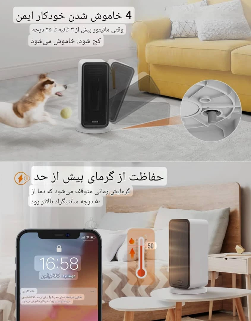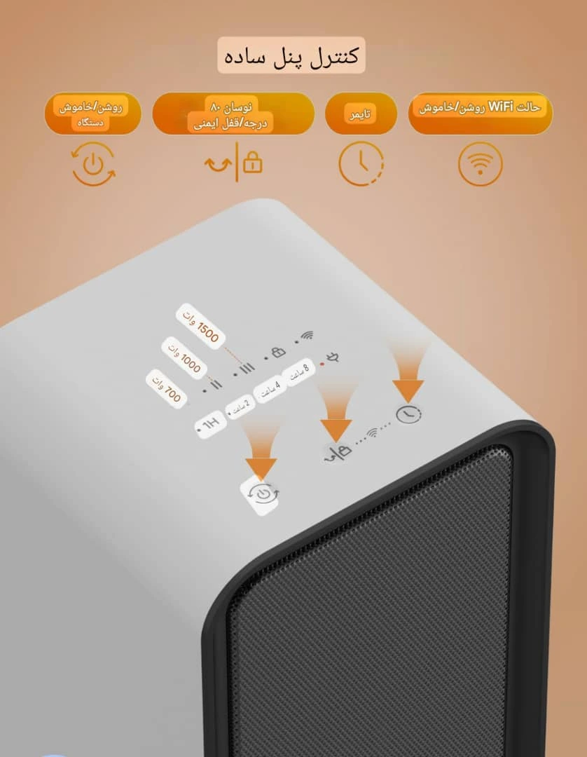 • حافظه تنظیمات: یادآوری تنظیمهای قبلی (گرما، چرخش، وایفای) بعد از خاموش و روشن شدن