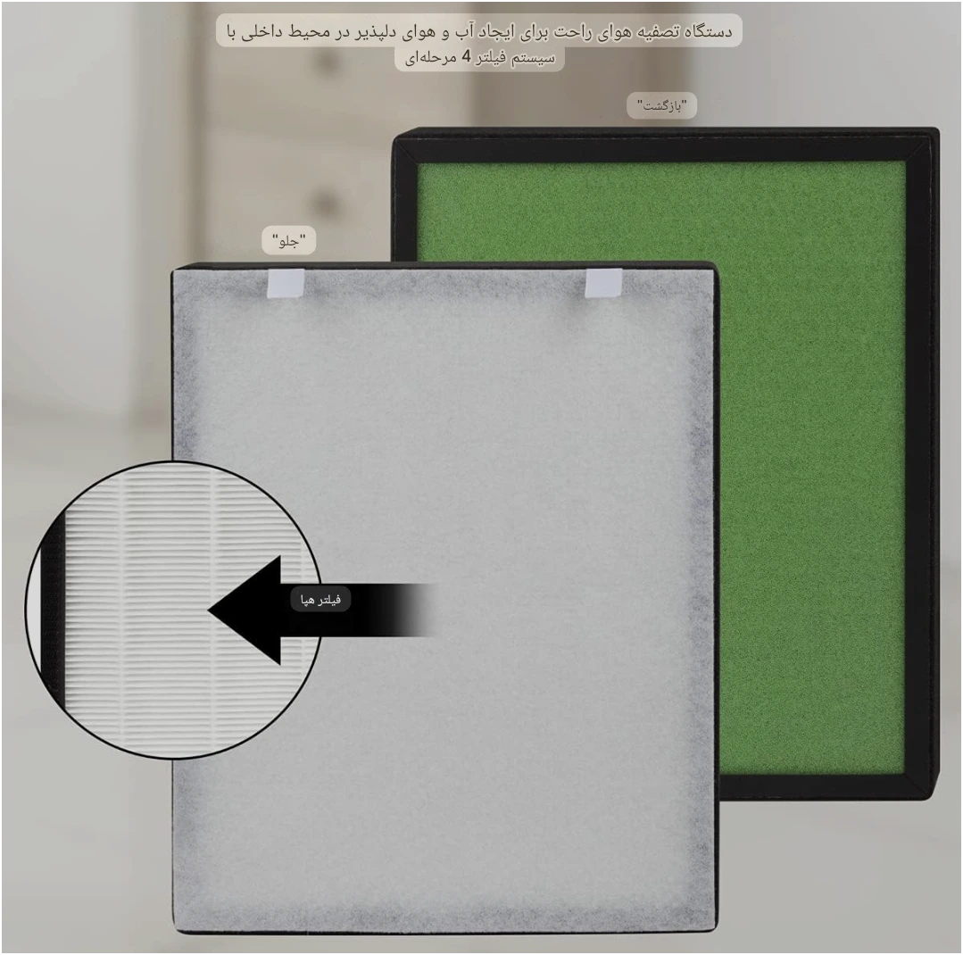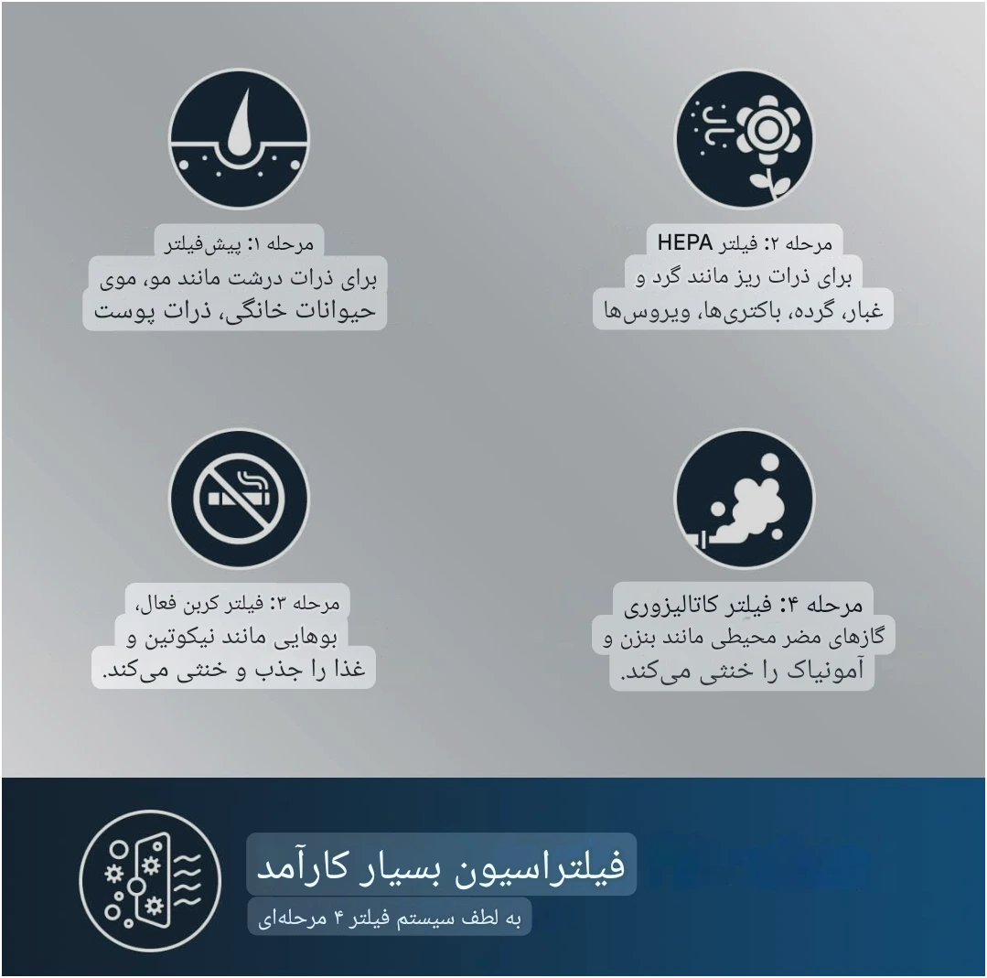• نوع فیلتر: سیستم ۴ مرحلهای (پیشفیلتر، HEPA، کربن فعال، کاتالیستی)