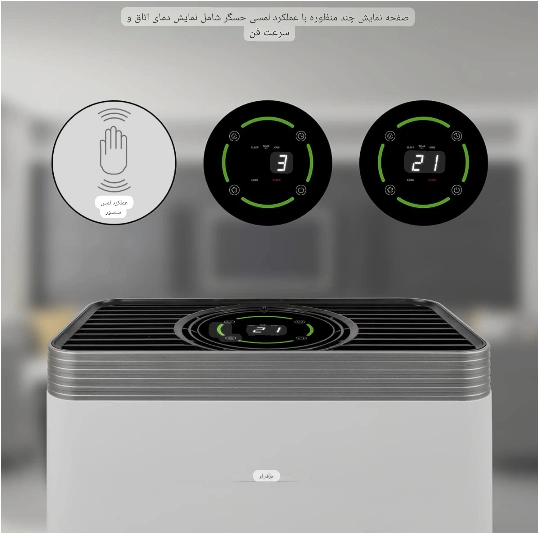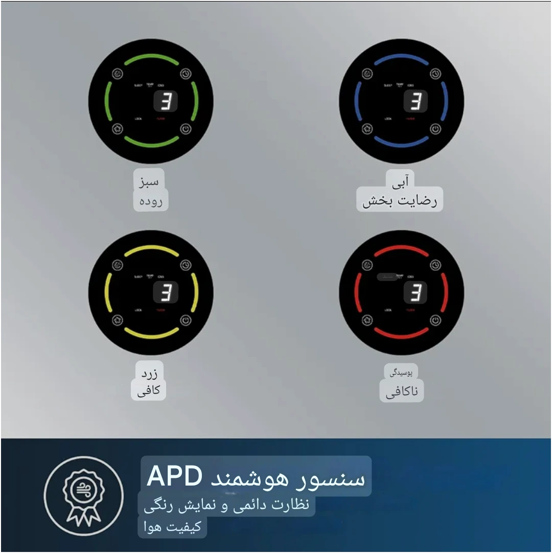 • دارای سنسور APD: نمایش لحظهای کیفیت هوا با ۴ رنگ (سبز، آبی، زرد، قرمز)